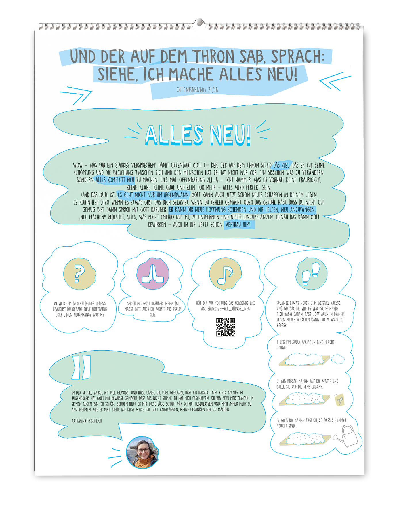 Der Ermutigungs-Kalender ist undatiert und ohne Monatsangabe. Die Teens können also starten, wann immer sie wollen, und jedes Poster so lange hängen lasse, wie so mögen, bevor sie zum nächsten umblättern.