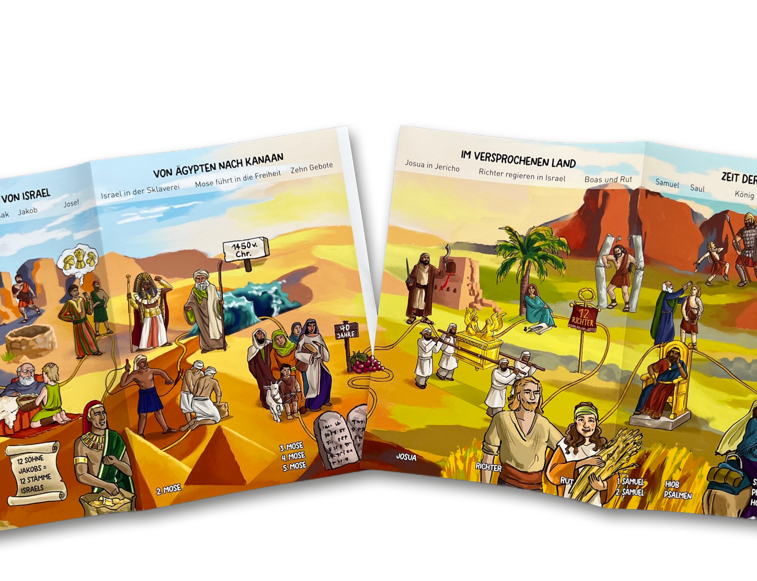 Das Leporello hilft Kindern, die Geschichten der Bibel besser einzuordnen. Auf zwei großen, farbenfrohen Panorama-Hintergründen sind zentrale Personen und Ereignisse von 1. Mose bis zur Offenbarung anschaulich dargestellt - in zeitlicher Reihenfolge und mit klarer Bildlegende. Die biblischen Bücher am unteren Rand zeigen, in welchem Buch die Geschichten zu finden sind.