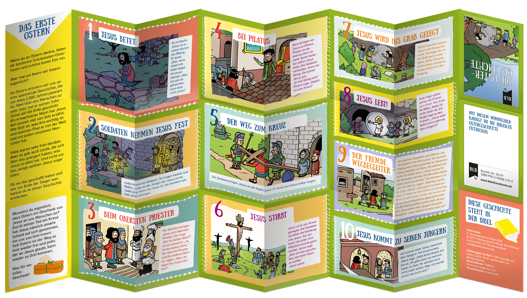 Das ansprechende Wimmelbild lädt Kinder zum Entdecken der Ostergeschichte ein. Auf der Rückseite wird diese anhand von sechs Bildausschnitten kindgerecht erzählt. Mit lustigen Suchaufträgen. Der Flyer eignet sich wunderbar zum Verteilen bei missionarischen Aktionen.