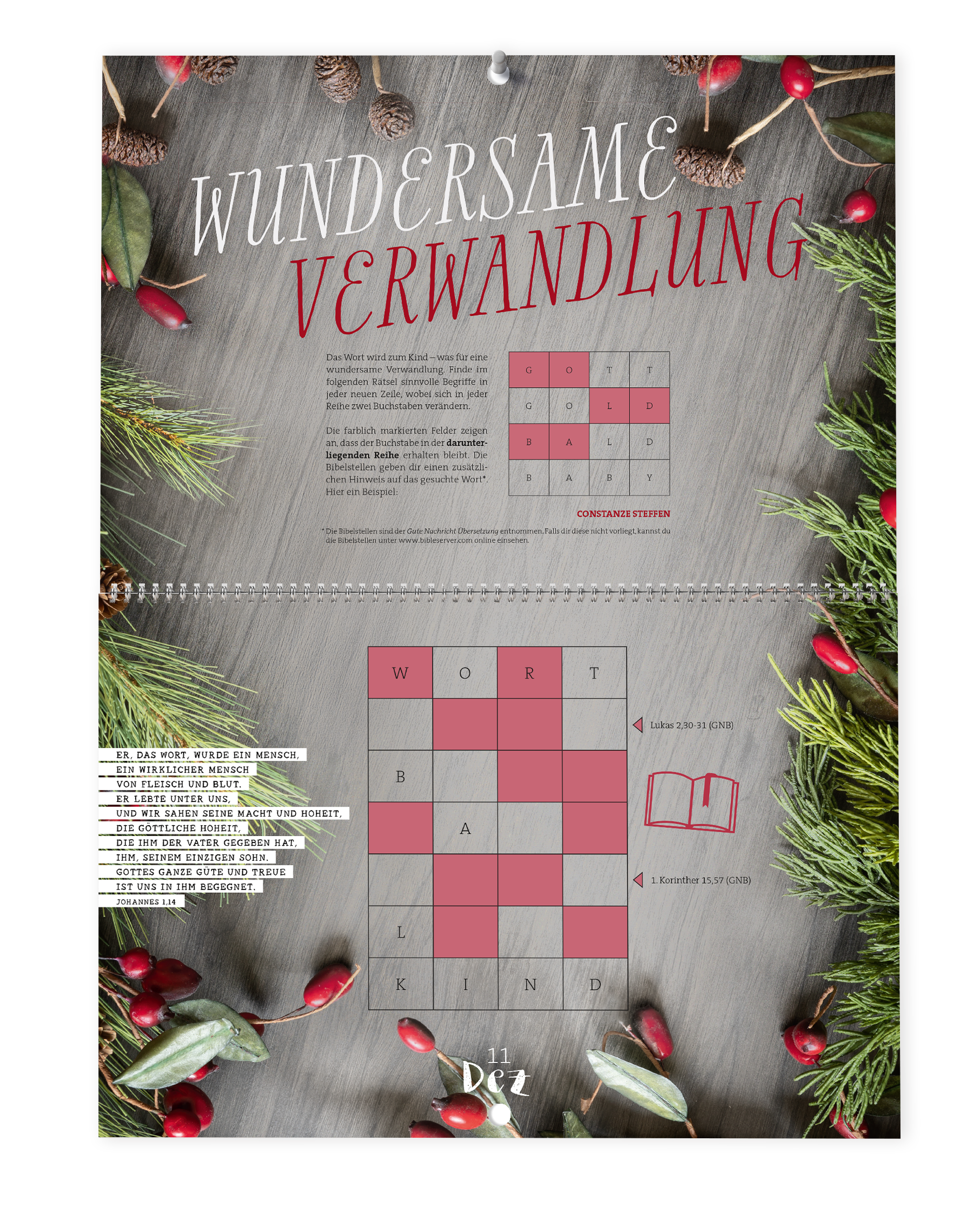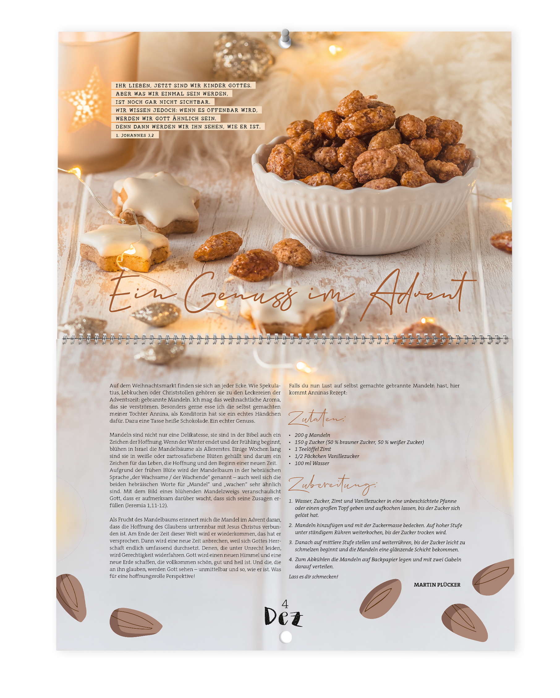 Gönnen Sie sich mitten im Vorweihnachtstrubel jeden Tag eine Auszeit am Adventskranz oder an Ihrem Lieblingsplatz! Dieser wunderschön gestaltete Adventskalender ist der ideale Begleiter dafür! Es erwartet Sie eine bunte Mischung aus heiteren und besinnlichen Texten, Geschichten und schönen Gedichten. Ein wertvolles Geschenk für Sie selbst oder zum Verschenken an alle, denen Sie auch diese besonderen Momente zum Einstimmen auf Weihnachten wünschen!Ein Adventskalender für Erwachsene WandkalenderSpiralbindung, 21 x 29,7 cm56 Seiten, 4-farbig