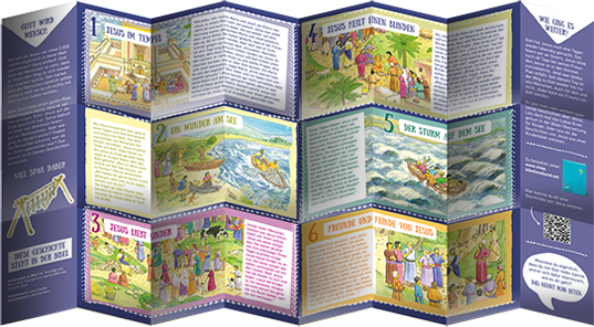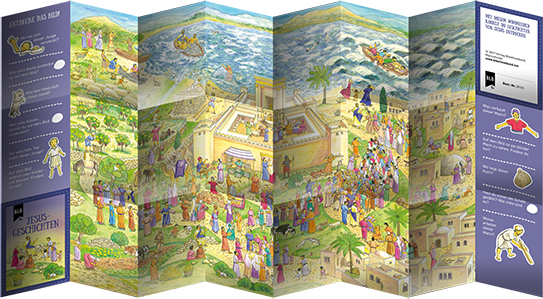Das ansprechende Wimmelbild lädt Kinder zum Entdecken der Jesus-Geschichten ein. Auf der Rückseite werden diese anhand von sechs Bildausschnitten kindgerecht erzählt. Mit lustigen Suchaufträgen. Der Flyer eignet sich wunderbar zum Verteilen.