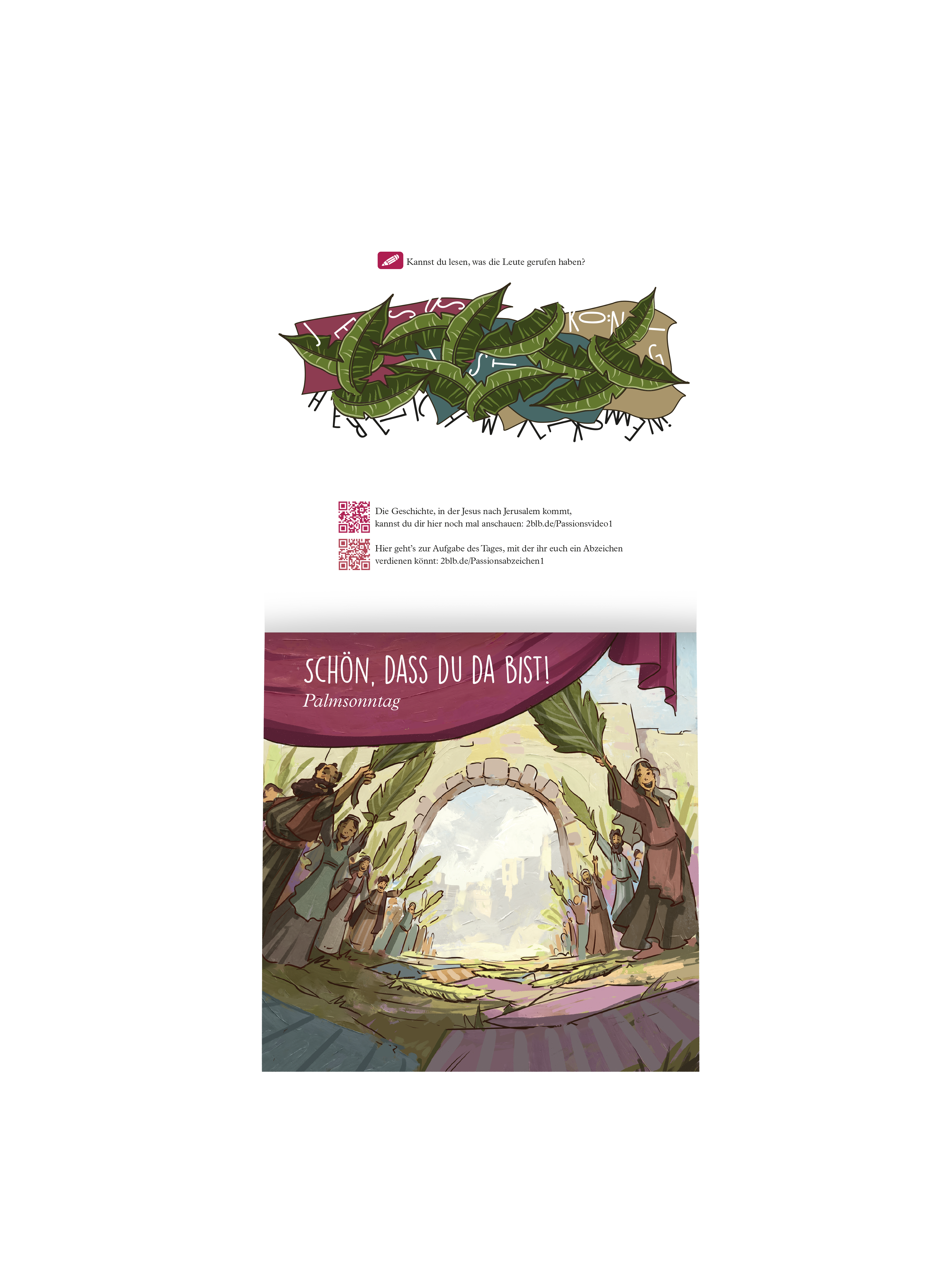 Jeden Tag gibt es ein neues Szenenbild zur Geschichte. Zusätzlich werden Figuren und Gegenstände zum Ausschneiden in die schmalen Schlitze im Holzbrett gesteckt und lassen täglich eine neue Szene aus der Passionsgeschichte entstehen: vom Einzug in Jerusalem über den Garten Getsemani, den Palast von Pilatus und Golgatha bis zum offenen Grab am Ostersonntag.