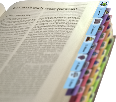 Mit diesem Griffregister finden sich Kinder leicht in ihrer Bibel zurecht. Der Name jedes Bibelbuches wird durch ein einprägsames Symbol ergänzt. Die bunten Farben auf den Einklebern geben den Aufbau der Bibel wieder.