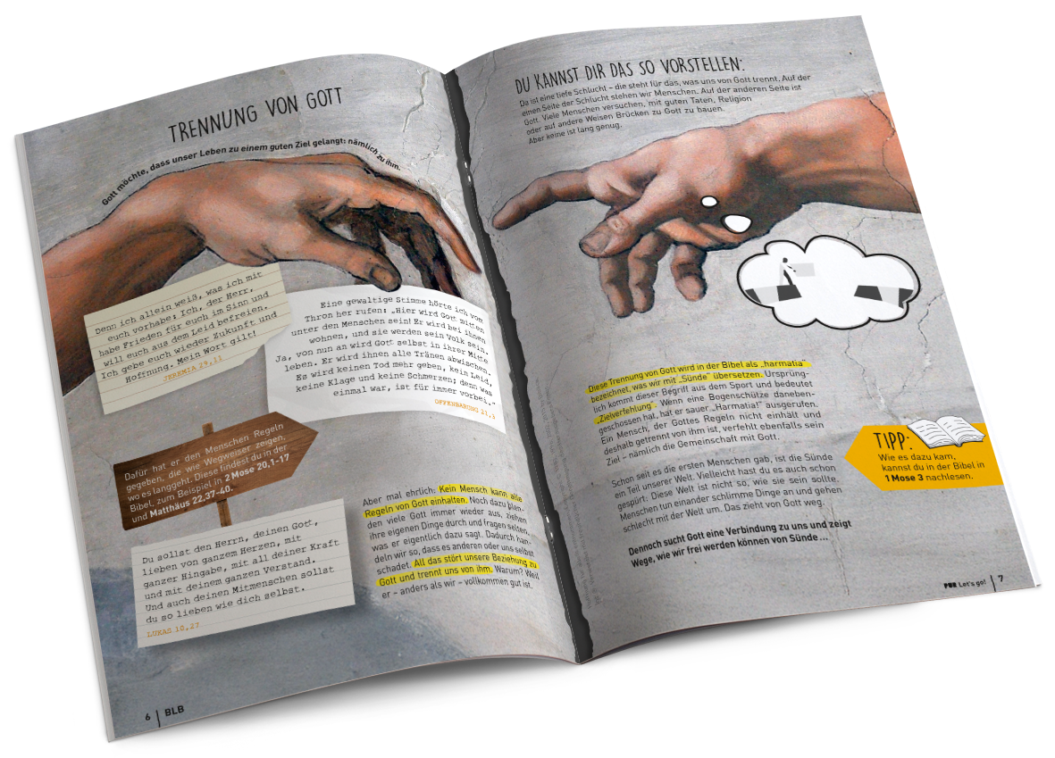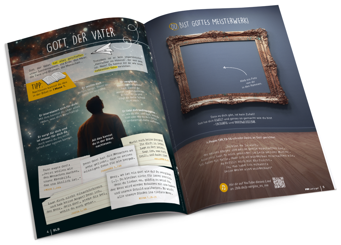 Diese Glaubens-Basics werden durch anschauliche Bilder und passende Bibelstellen ergänzt. So können die Teens sich besser vorstellen, was gemeint ist, und selbst noch einmal in der Bibel nachlesen.
